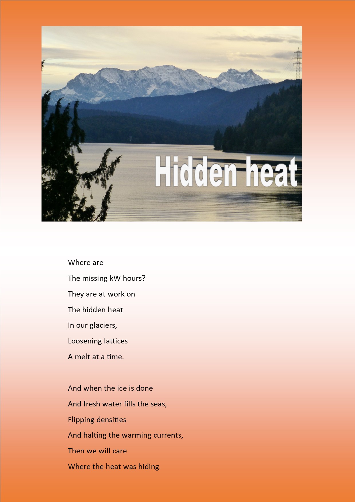 And when the ice is done And fresh water fills the seas, Flipping densities And halting the warming currents, Then we will care Where the heat was hiding. Hiding the heatis in 'I heard the river laugh'