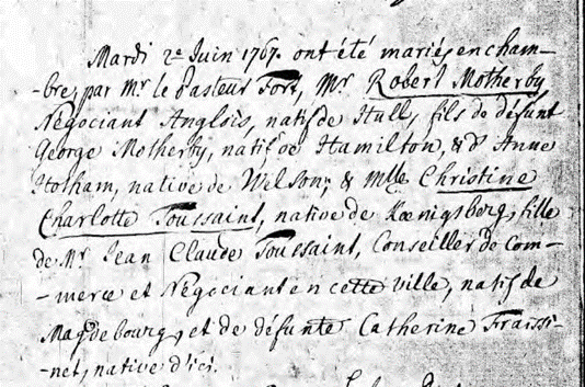 Marriage certificate of Robert Motherby and Charlotte Toussaint from the Huguenot Church, which clearly states, that he is from Hull. (Added by Bill Longbone, Friends of Hull General Cemetery)