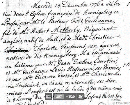 A long-time friend of Immanuel Kant, Motherby was born on 23rd Dec. 1736 in Hull. He had four brothers and three sisters. His father George (b. 20th Dec. 1688) married Anne Hotham (died 1748). Robert probably arrived in Kőnigsberg around 1751 when he was 18 years of age. Through a joint contact in Hull, he was recruited as a young man by Joseph Green, initially as an assistant. Although he spoke little German, he settled easily and became a business partner and eventually took over the firm Green, Motherby & Co. In 1762 he married Charlotte Toussaint. They had 11 children. One of them was William Motherby, who went on to become a doctor and expert in agriculture in Berlin. Kant always joined the family for Sunday lunch and played and joked with the children.