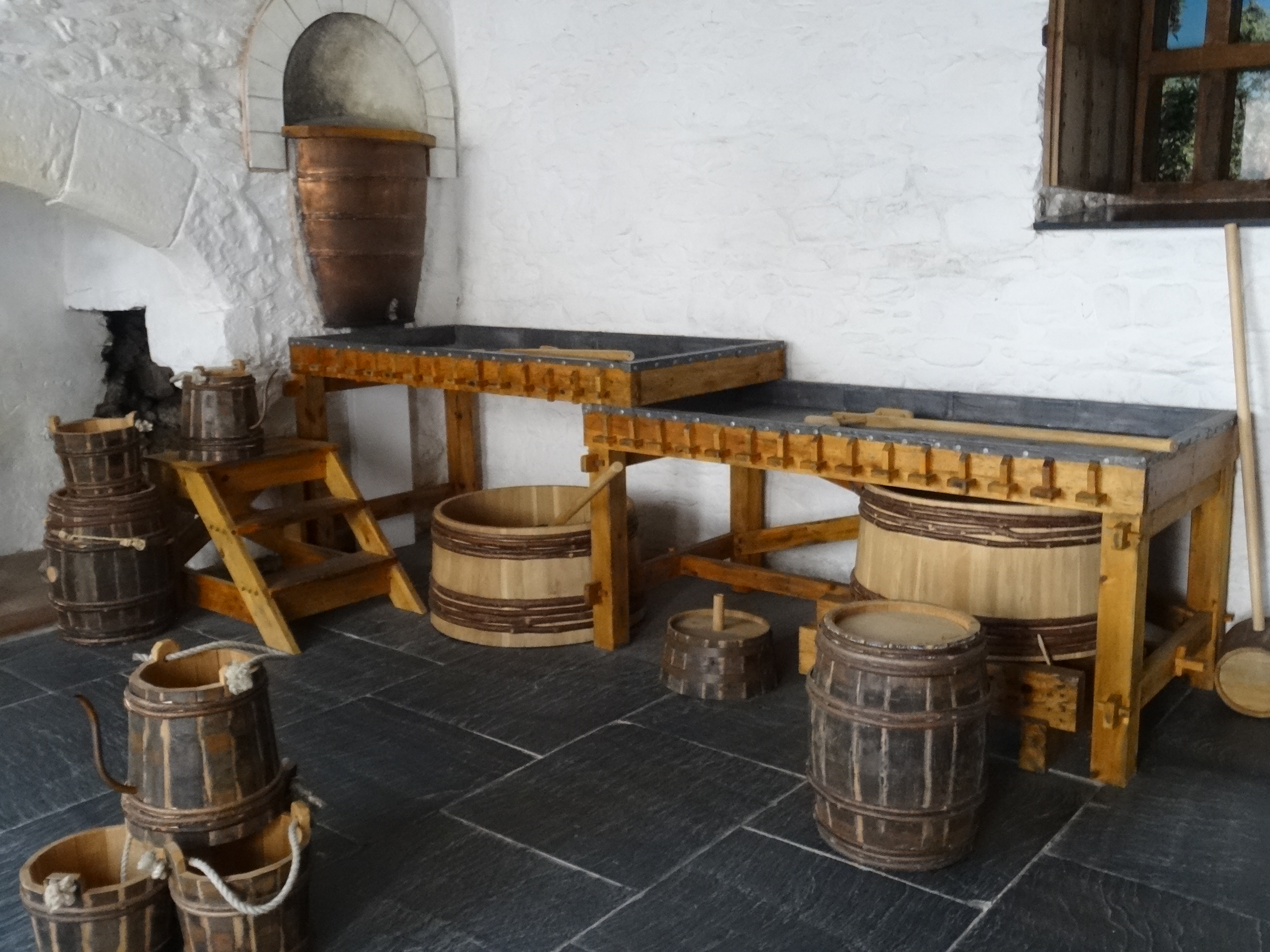 This house brewery, in a Welsh museum is close to intact. The copper, (far left) heated the mash liquor. I can’t be sure where the mash tun stood, but somewhere that could be fed with water from the copper. At the moment it is on the floor to the right of the steps. The large trays were for cooling the wort, prior to running it into a fermenter, underneath the trays.The spouted buckets were for sparging.