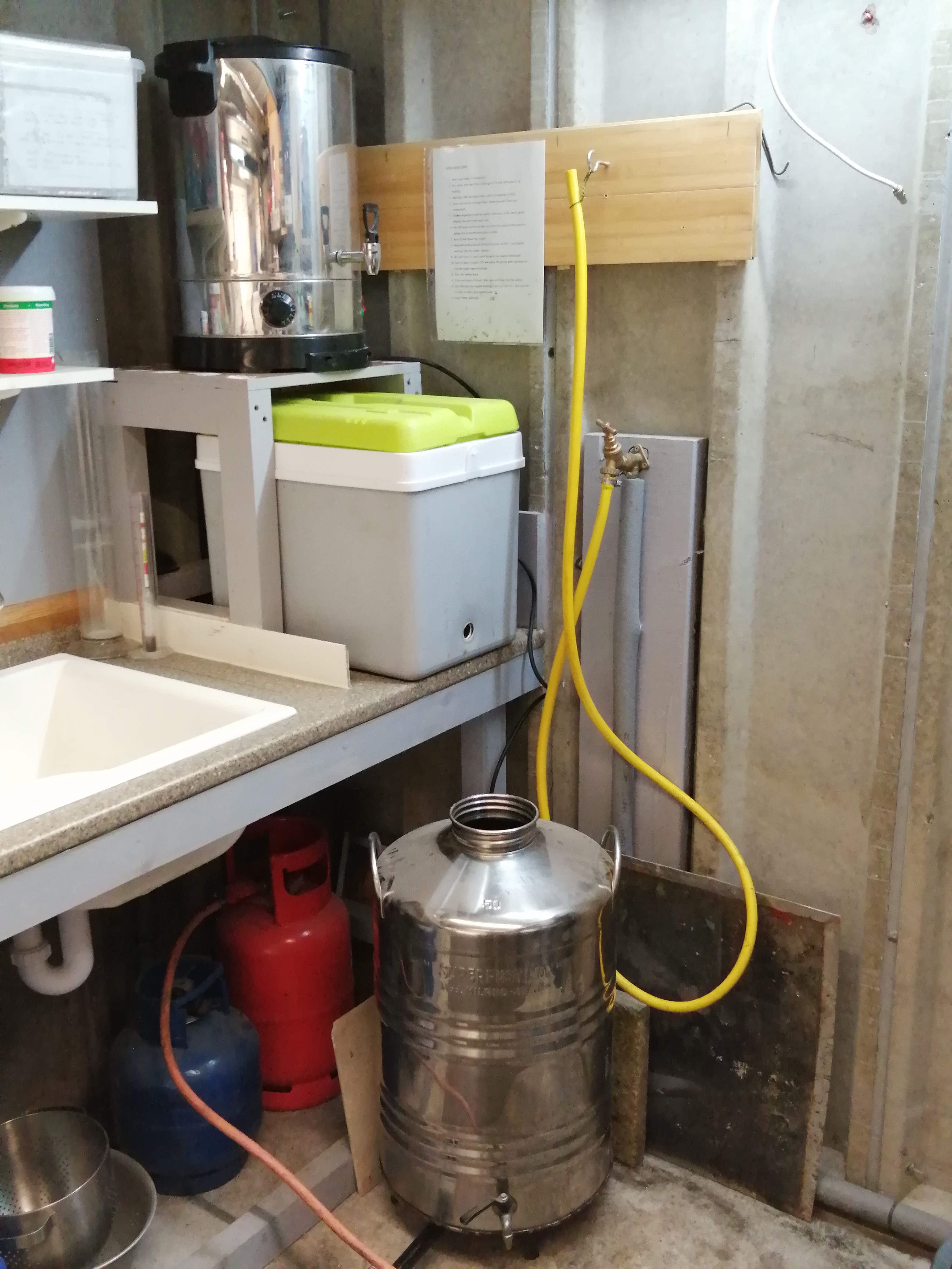 I mentioned brewing in a small space, in blog no. 1. It’s a problem many will face and when my family became fed up with me blocking the kitchen and odourising the house with wort smell and then boiling hops, a solution had to be found. The smell isn’t that bad so don’t panic, but we know how judgemental the friends of teenage daughters can be! Thus, we built a tiny brewhouse, which also served as a pantry, so I was allocated the sink and about 1 ½ m2 space – or about 16 sq foot for US readers.