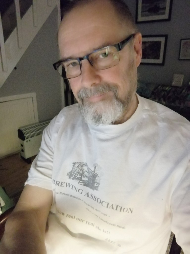 A sample of a historic gyle, no longer made, but within your reach as a craft brewer.The author, in his Craft Brewing Association sweat shirt, now looking faded, with the travelling brewing rig from Hahn on the front. Hahn claimed he brewed for the army while on manoeuvres. Early 19th century.